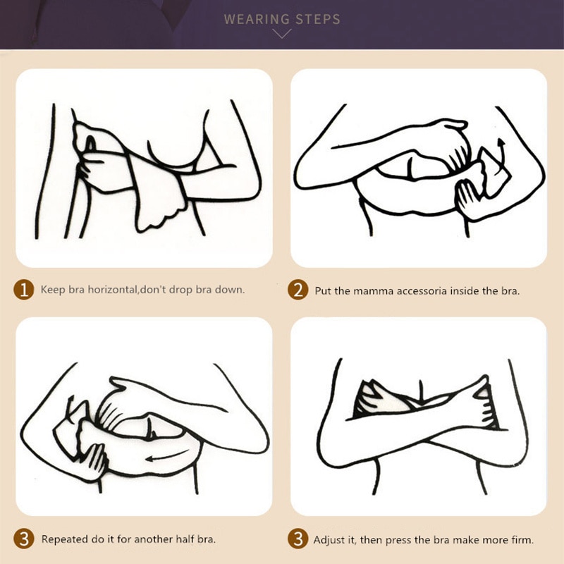 How to Wear: 1. Gently clean your chest area with mild soap and water to remove body oil and residue from skin. Dry your skin with a soft towel. DO NOT USE powders, oils, or fragrances anywhere near the chest area prior to applying your bra 2. First stick to a section, to maintain the level, do not let the bra fall 3. The breast side to the middle of the dial, hold up the chest, and then paste the bra 4. Repeat the third step and paste the other side 5. With both hands on the bra cups press firm for a few seconds to secure the hold. Now, you are ready to enjoy the total freedom and comfort of your invisible bra
