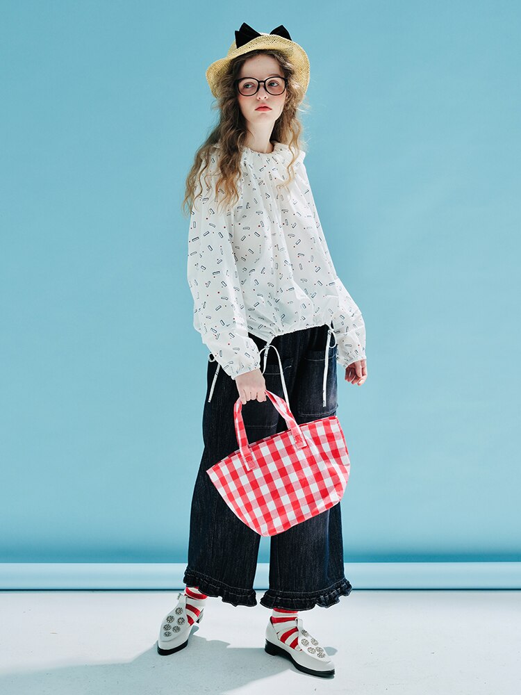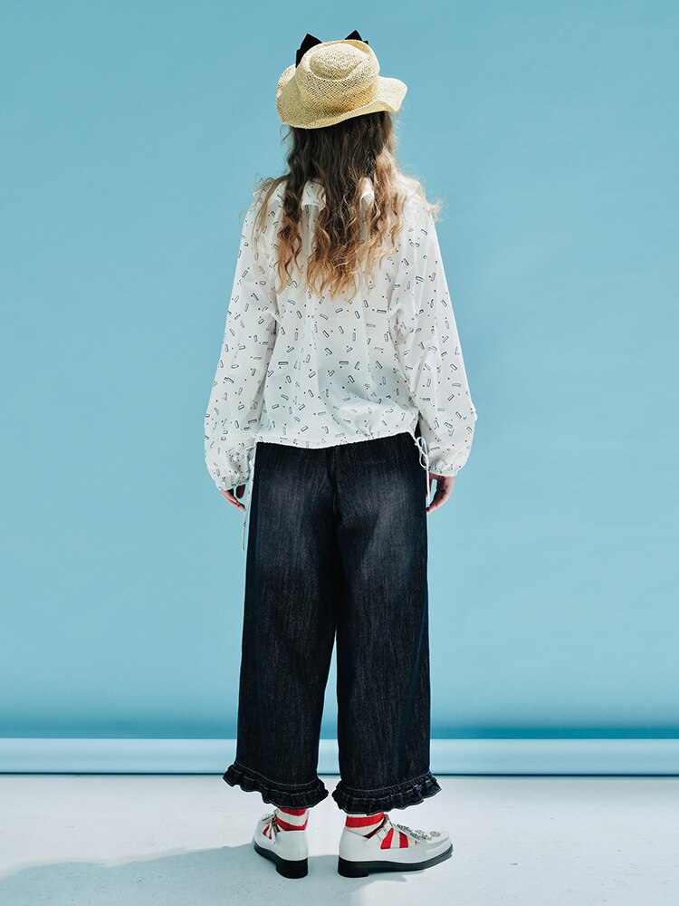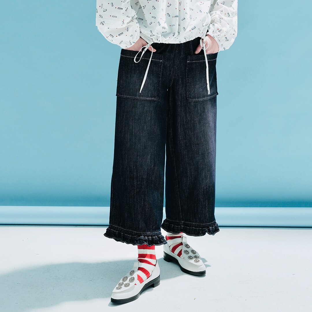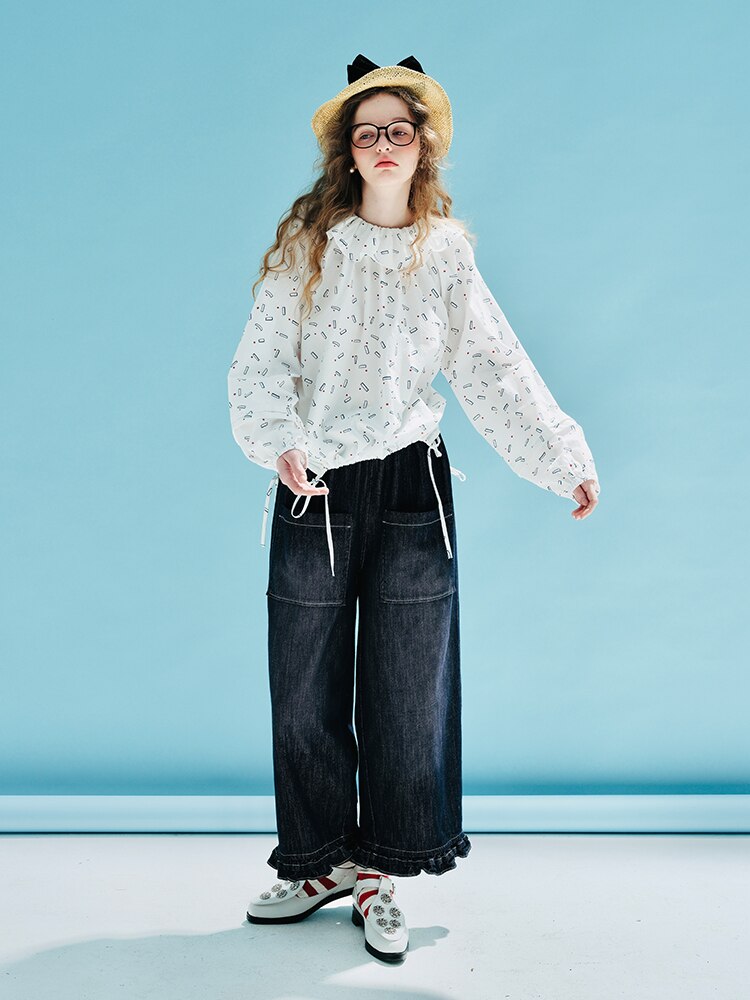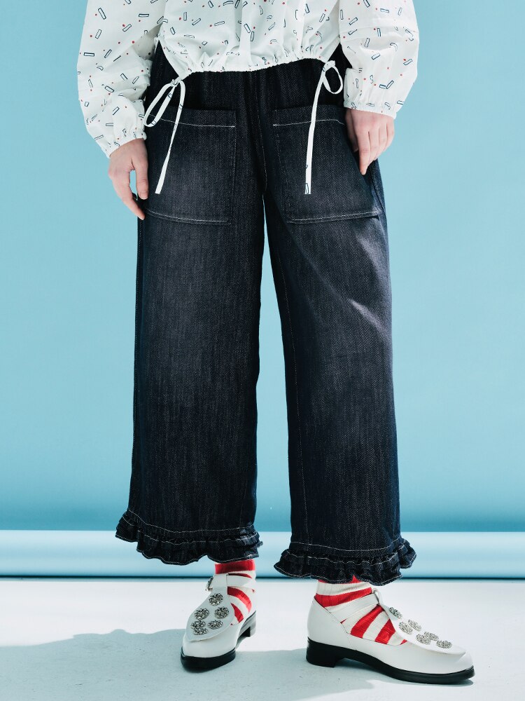 Imakokoni's original design spring new elastic waist jeans pure cotton ruffle casual straight loose pants women's wear 233984