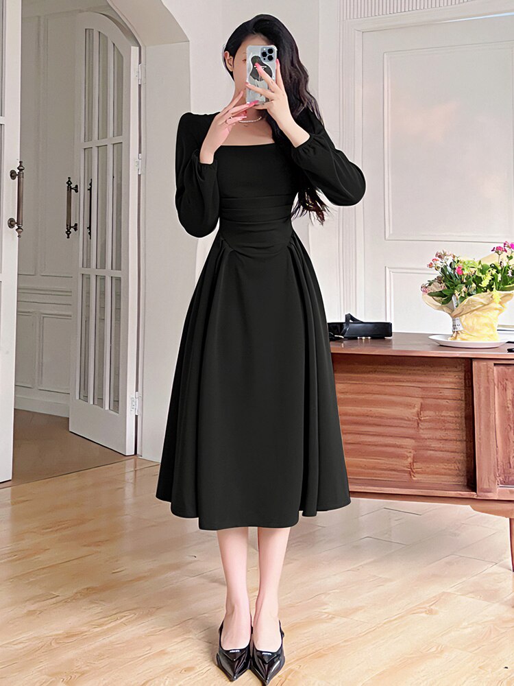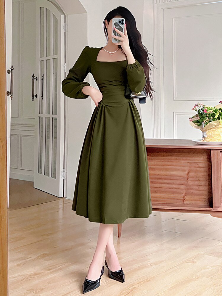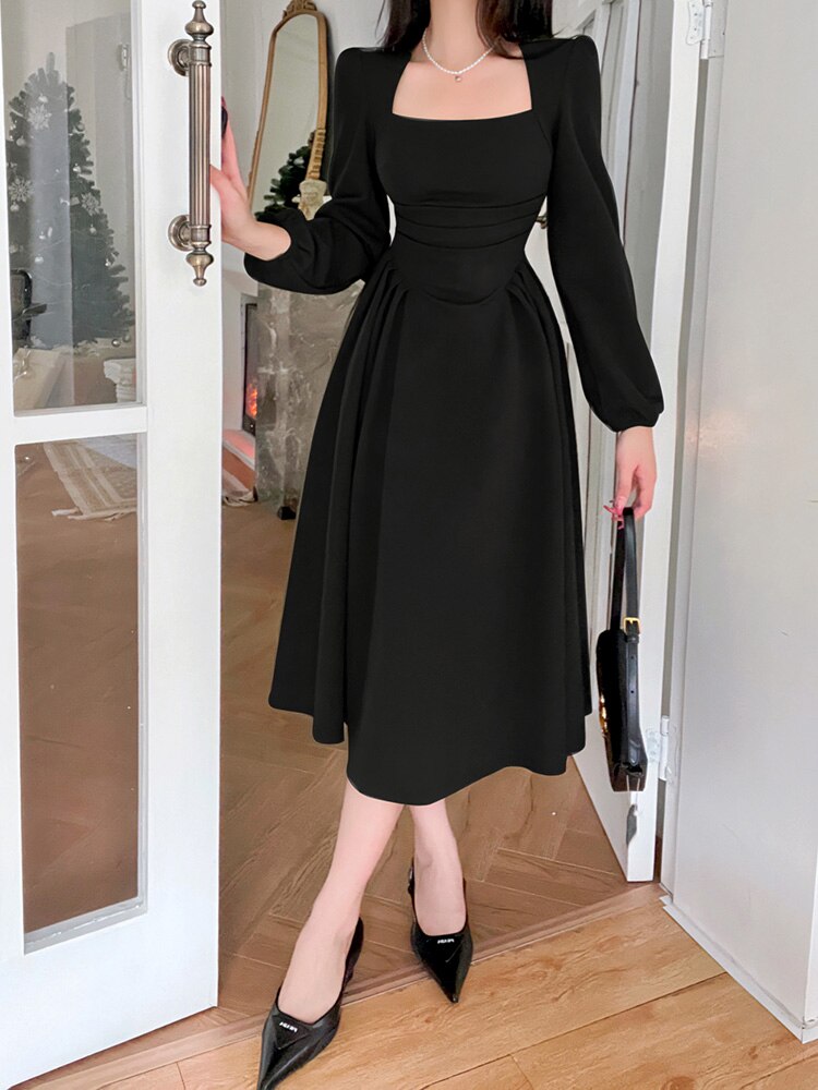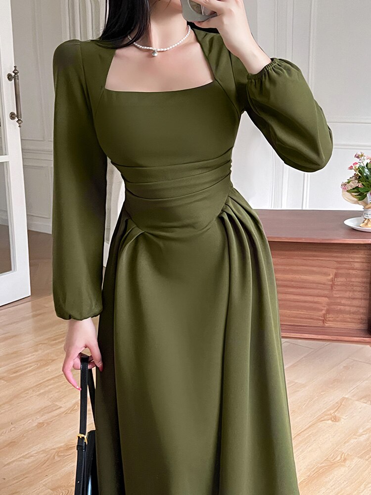 Women Midi Dress Folds Puff Sleeve Corsets Sexy Elegant Bodycon Autumn Elegant Party Casual Lady Long Dress Streetwear