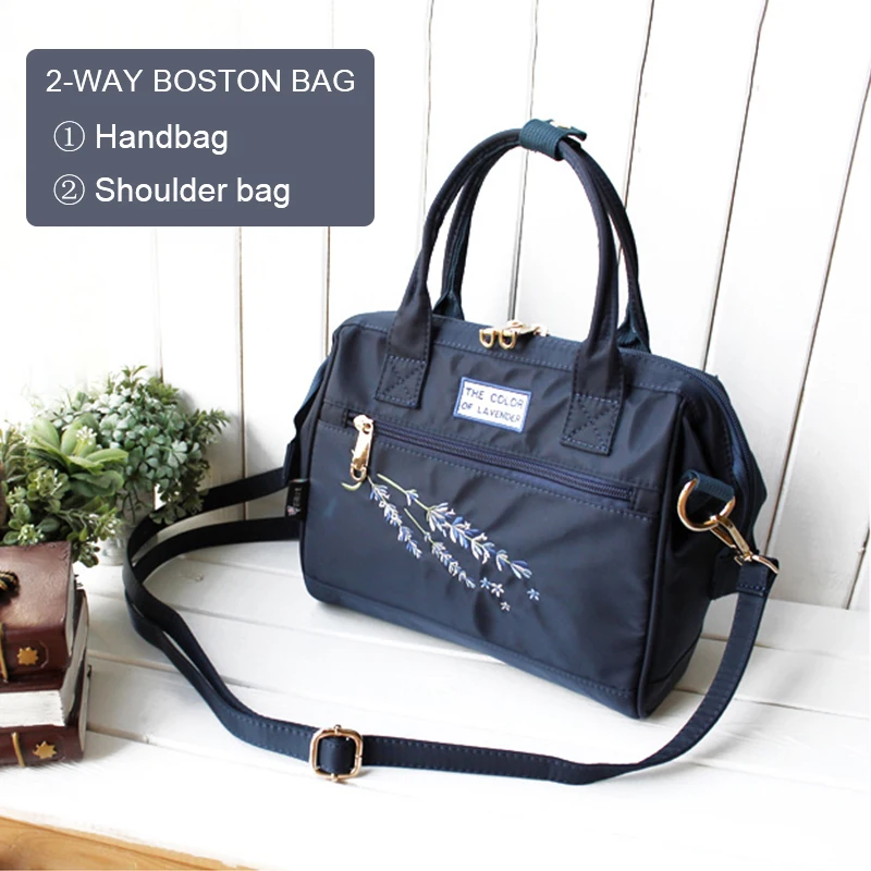 Flower Princess 2-Way Square Boston Bag Embroidery Nylon Women Handbag Shoulder Bags Girls Lady Wide Mouth Doctor Bag Handbags